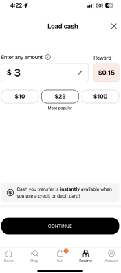 - Cash loaded with debit or credit cards will be available instantly. If a you load cash from a bank account, standard 3-5 day processing times apply. Rewards will be available 2 days after cash is loaded.